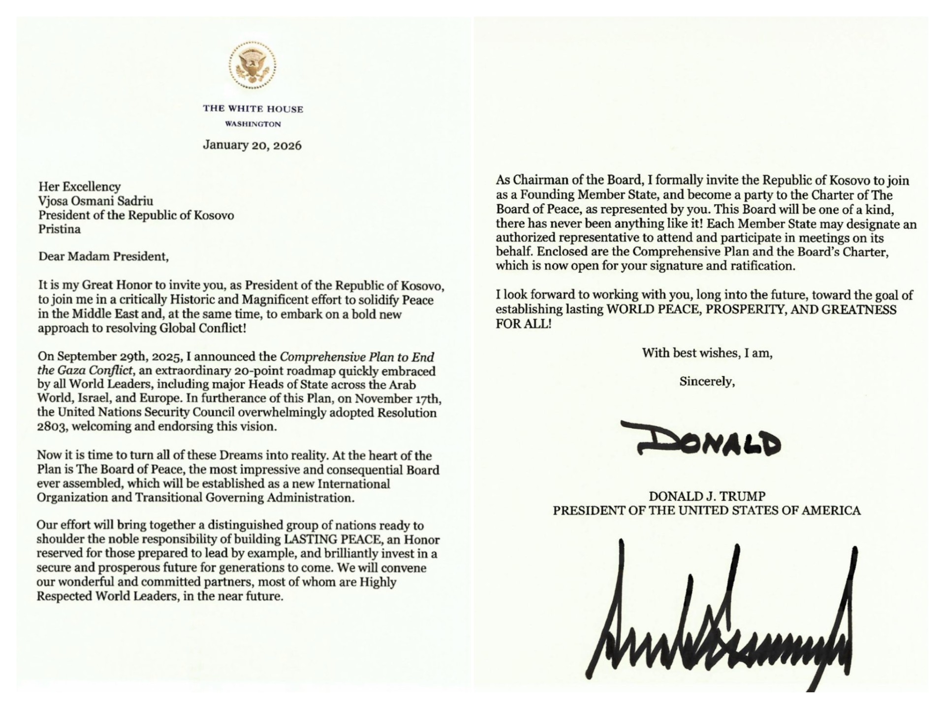 Si Kryetar i Bordit, unë e ftoj zyrtarisht Republikën e Kosovës të bashkohet si Shtet Anëtar Themelues dhe të bëhet palë në Kartën e Bordit të Paqes, të përfaqësuar nga Ju. Ky Bord do të jetë unik në llojin e tij; nuk ka pasur kurrë diçka të tillë më parë. Çdo shtet anëtar mund të caktojë një përfaqësues të autorizuar për të marrë pjesë dhe kontribuar në mbledhjet në emër të tij. Bashkëngjitur janë Plani Gjithëpërfshirës dhe Karta e Bordit, të cilat tani janë të hapura për nënshkrimin dhe ratifikimin tuaj.