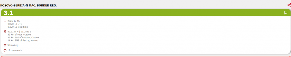 Një tërmet me magnitudë 3.1 ballë të shkallës Rihter është regjistruar sot në mëngjes në rajonin kufitar mes Kosovës, Serbisë dhe Maqedonisë së Veriut. Sipas të dhënave sizmologjike, lëkundja ka ndodhur më 15 dhjetor 2025, rreth orës 07:20 sipas kohës lokale (06:20 UTC). Epiqendra e tërmetit është lokalizuar në koordinatat 42.3734° N, 21.2843° E, rreth…