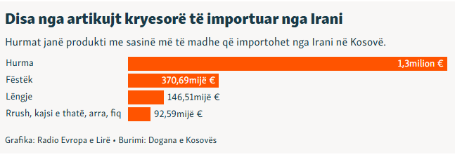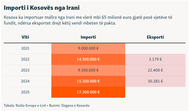 Sipas të dhënave të Doganës së Kosovës, vitin e kaluar, vlera e importeve nga Irani arriti në 17 milionë euro, ndërsa eksporte nuk u regjistruan.