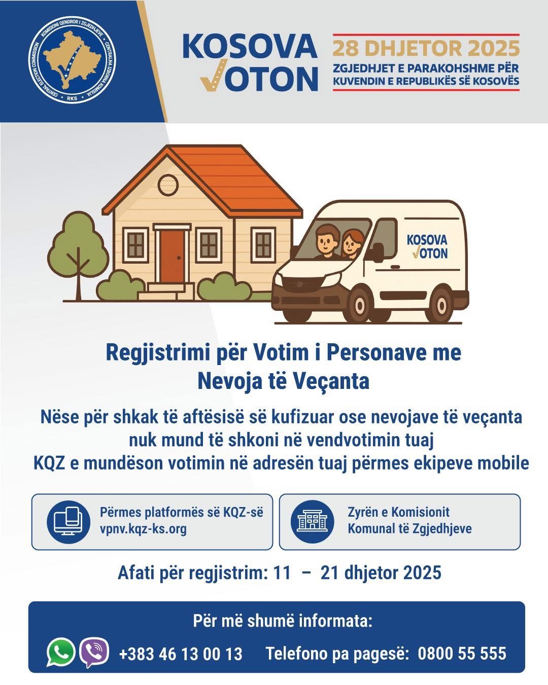 Komisioni Qendror i Zgjedhjeve (KQZ) ka hapur afatin për regjistrimin e personave me nevoja të veçanta që dëshirojnë të votojnë në adresën e tyre të banimit, në kuadër të zgjedhjeve të parakohshme për Kuvendin e Republikës së Kosovës, të cilat do të mbahen më 28 dhjetor 2025.