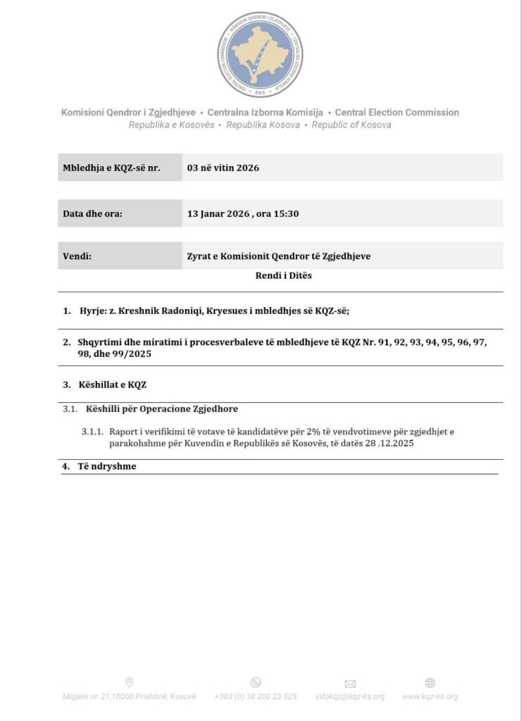 Sipas njoftimit të KQZ-së, një nga pikat kryesore do të jetë: “Raport i verifikimit të votave të kandidatëve për 2 për qind të vendvotimeve për zgjedhjet e parakohshme për Kuvendin e Republikës së Kosovës, të datës 28 dhjetor.”, thuhet në njoftimin e KQZ-së.
