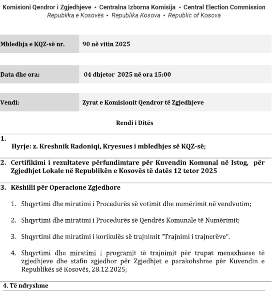 Në këtë mbledhje, një nga pikat kryesore të rendit të ditës do të jetë certifikimi i rezultateve përfundimtare për zgjedhjet për Kuvendin Komunal të Istogut, të mbajtura më 12 tetor, raporton lajmi.net