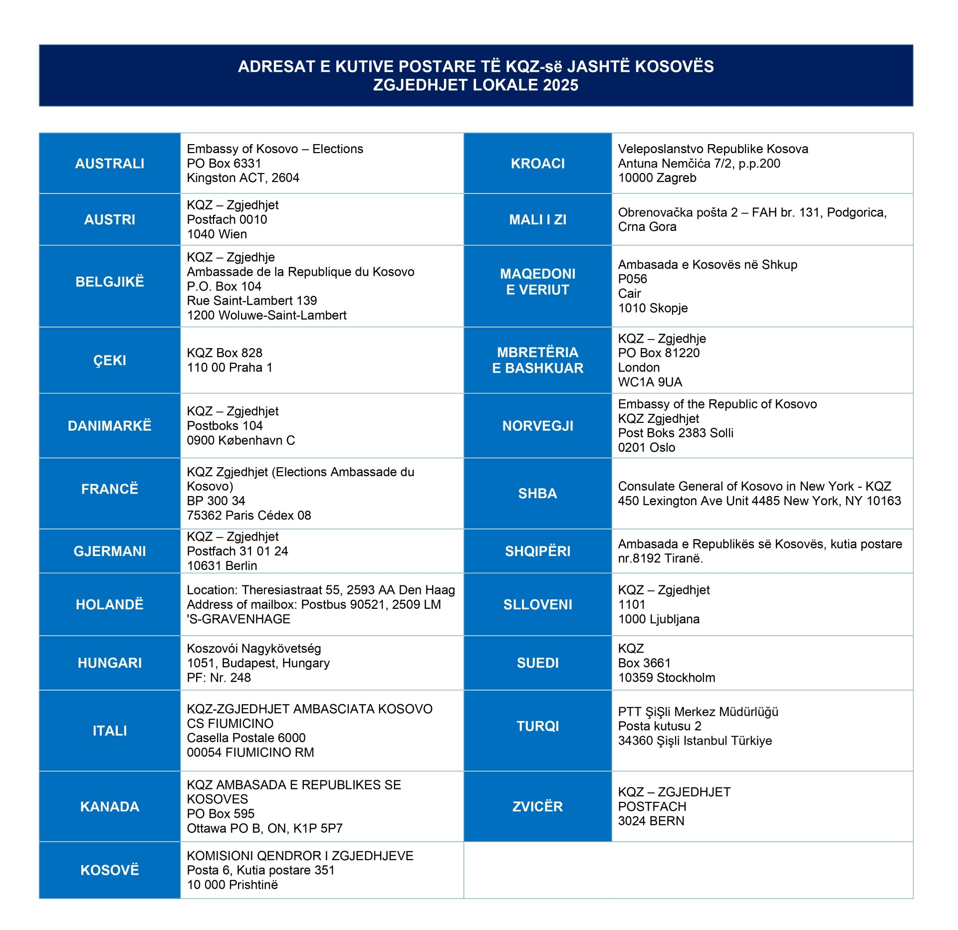 “Deri më 11 tetor 2025, votuesit e regjistruar jashtë Kosovës duhet të dërgojnë pakon e tyre me fletëvotime në ndonjërën nga kutitë postare të KQZ-së.  Me qëllim të ofrimit të mundësisë për votim për shtetasit që janë regjistruar për të votuar përmes postës, kutitë postare janë funksionale në këto shtete: Australi, Austri, Belgjikë, Çeki, Danimarkë, Francë, Gjermani, Holandë, Hungari, Itali, Kanadë, Kosovë, Kroaci, Mali i Zi, Maqedoni e Veriut, Mbretëri e Bashkuar, Norvegji, ShBA, Shqipëri, Slloveni, Suedi, Turqi dhe Zvicër”, ka njoftua KQZ. /Lajmi.net/