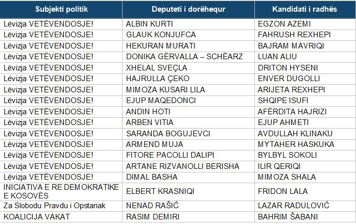 “Bazuar në kërkesën e presidentes së Republikës së Kosovës, znj. Vjosa Osmani të dorëzuar më 12 shkurt 2026, për të rekomanduar kandidatët e ligjshëm të radhës, për arsye se kanë dhënë dorëheqje nga pozita e deputetit të Kuvendit të Republikës së Kosovës, Komisioni Qendror i Zgjedhjeve, duke vepruar në pajtim me nenin 112, paragrafin 4 të Ligjit për Zgjedhjet e Përgjithshme, rekomandon 18 kandidatët e radhës, të certifikuar në zgjedhjet e parakohshme për Kuvendin e Republikës së Kosovës, të cilat janë mbajtur më 28 dhjetor 2025”, ka njoftuar KQZ.