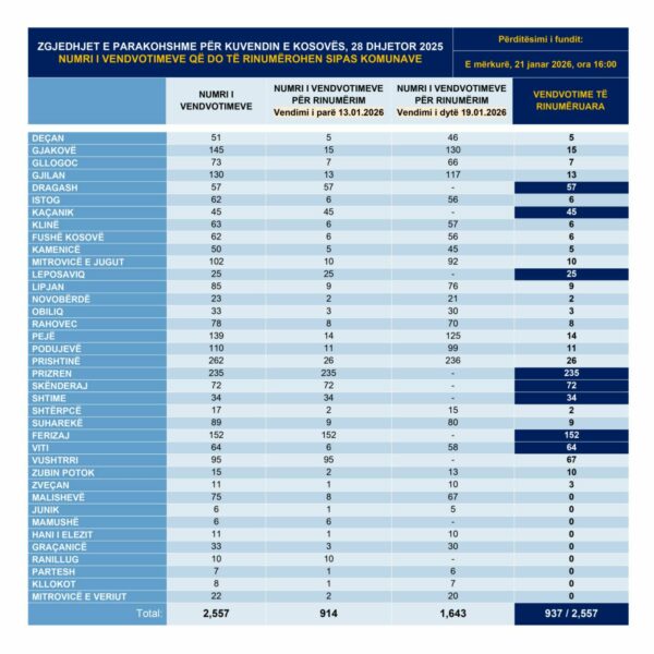 Në Qendrën e Numërimit dhe Rezultateve është duke vazhduar numërimi i fletëvotimeve sipas listës së vendvotimeve për të cilat KQZ ka marrë vendim që të rinumërohen. Nga fillimi i këtij procesi (e martë, 13 janar 2026, ora 18:00) dhe deri më tani (e mërkurë, 21 janar 2026, ora 16:00) janë rinumëruar 937 nga 2,557 vendvotime.…