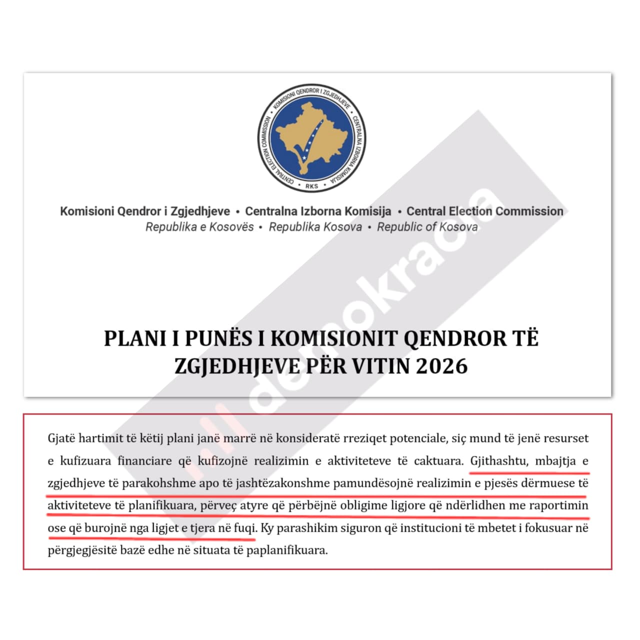 “Mbajtja e zgjedhjeve të parakohshme apo të jashtëzakonshme pamundësojnë realizimin e pjesës dërmuese të aktiviteteve të planifikuara, përveç atyre që përbëjnë obligime ligjore që ndërlidhen me raportimn ose që burojnë nga ligjet e tjera në fuqi”, thuhet në këtë dokument të siguruar nga Demokracia.