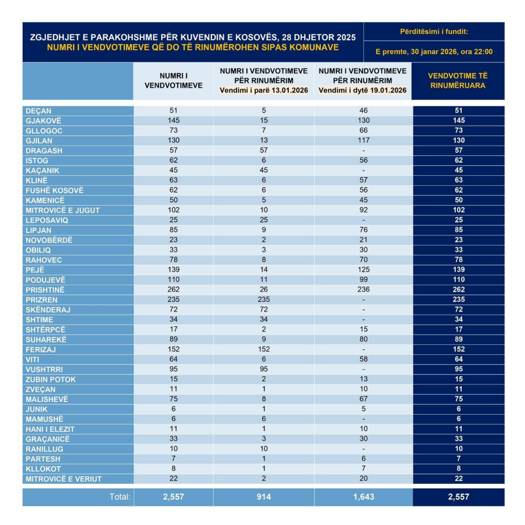 Në Qendrën për Numërimin e Rezultateve është përmbyllur rinumërimi i 2,557 vendvotimeve të zgjedhjeve të parakohshme për Kuvendin e Kosovës. Në platfomën e KQZ-së për rezultate https://resultsparliamentary2025.kqz-ks.org/ në hapësirën QNR > Rinumërim, janë paraqitur rezultatet pas rinumërimit. KQZ mori këto vendime për rinumërim me qëllim të të garantimit të saktësisë së rezultateve zgjedhore dhe për të siguruar…