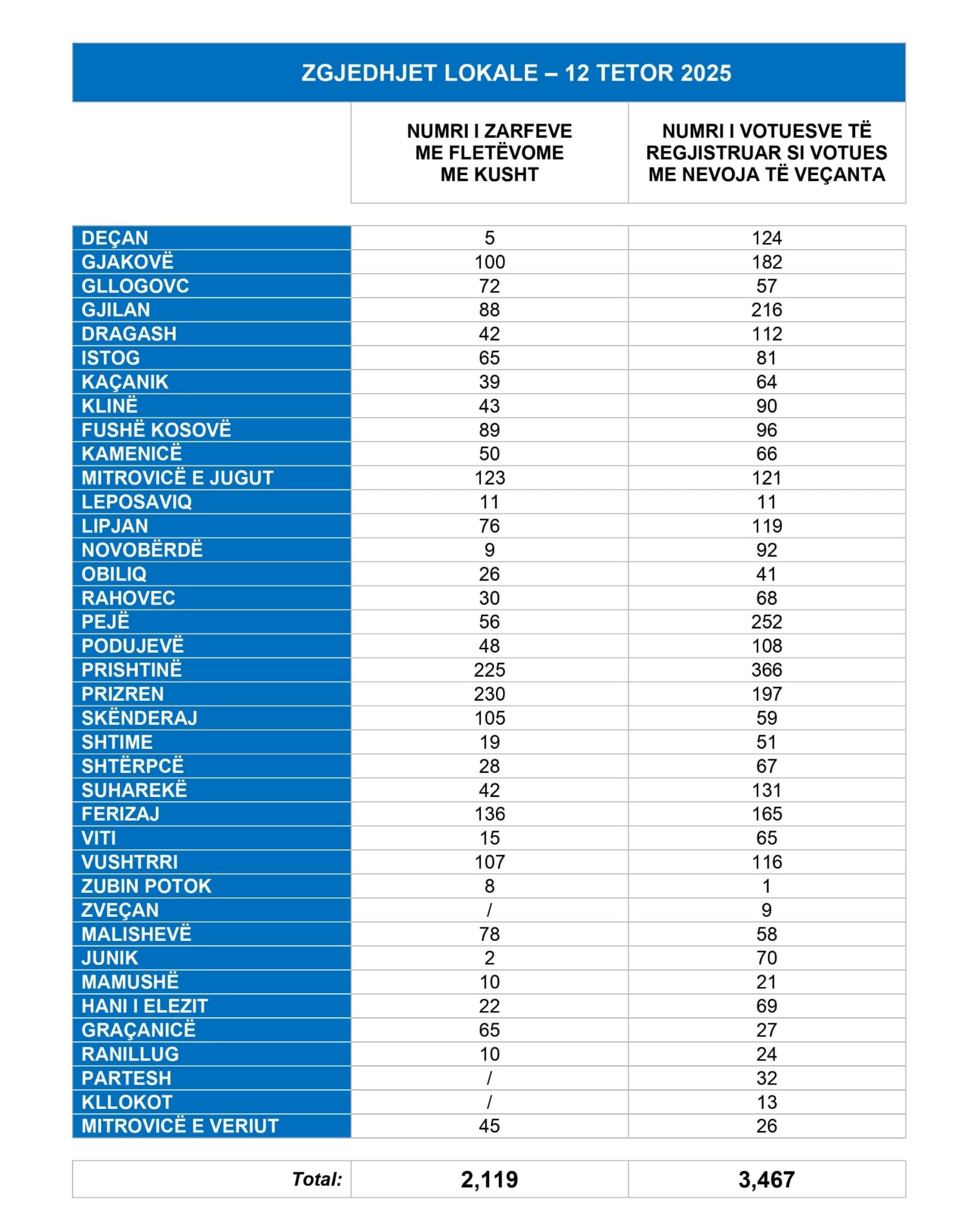 Ndryshe sipas KQZ-së, në votimin me kusht janë më shumë se 2,119 zarfe me fletëvotime, që i përkasin të dyja llojeve të zgjedhjeve – për kryetarë komunash dhe për kuvendet komunale.