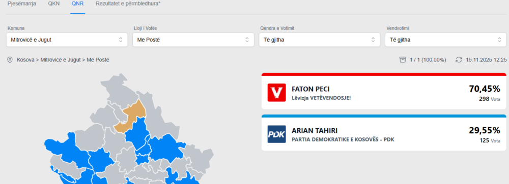 Në faqen e KQZ-së tashmë janë publikuar votat me postë për Komunën e Mitrovicës së Jugut. Faton Peci nga VV ka marr më shumë vota se Arian Tahiri nga PDK, raporton lajmi.net Faton Peci i VV-së ka marrë gjithsejtë 298 vota, derisa Arian Tahiri i PDK-së ka marrë 125 vota./Lajmi.net/