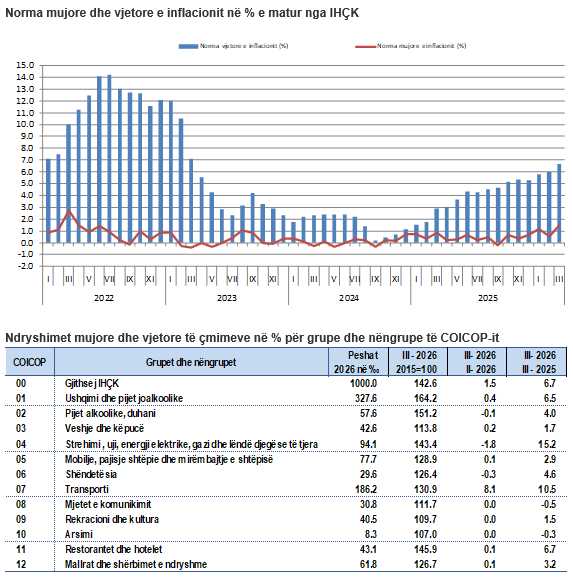 Indeksi i tërësishëm i harmonizuar i çmimeve të konsumit është më i lartë në një mesatare prej 6,7 % në muajin mars 2026, krahasuar me muajin mars 2025. Inflacioni mujor ishte 1,5 % në muajin mars 2026.