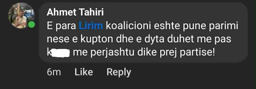 “E para Lirim koalicioni është punë parimi nëse e kupton dhe e dyta duhet me pas k*** me e përjashtu dikë prej partisë”, ka shkruar Ahmet Tahiri, vëllai i Xhafer Tahirit. /Lajmi.net/
