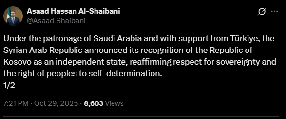 Ministri i Jashtëm i Sirisë, Asaad Hassan Al-Shaibani, ka shkruar në “X” për njohjen e Kosovës nga Siria. Nga Riadi i Arabisë Saudite, presidentja Vjosa Osmani njoftoi për njohjen Kryediplomati sirian tha se njohja u bë nën patronazhin e Arabisë Saudite dhe me mbështetjen e Turqisë. “Nën patronazhin e Arabisë Saudite dhe me mbështetjen e…