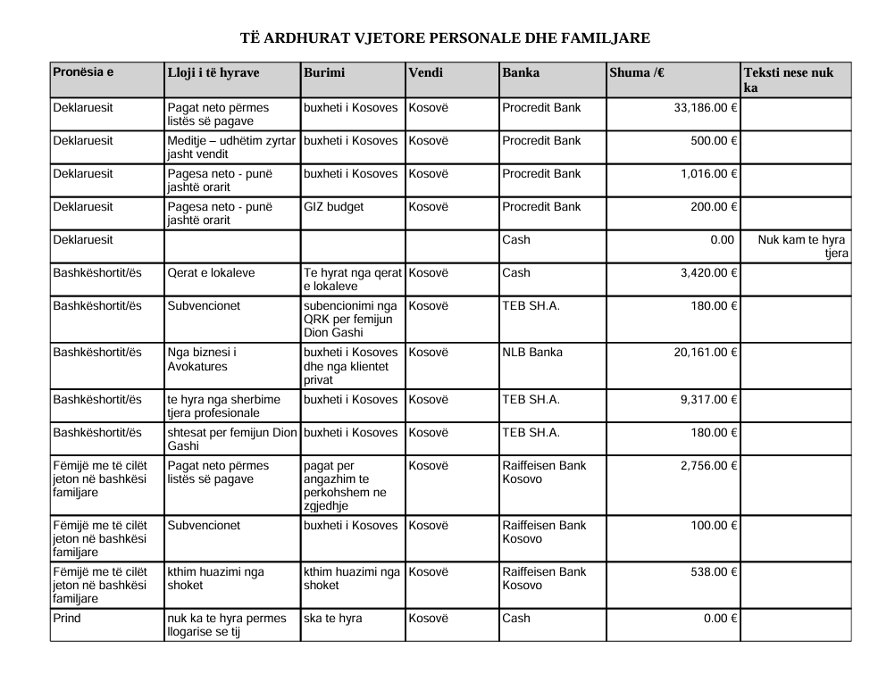 Ai gjithashtu ka deklaruar 180 euro subvencione për fëmijën e tij, pastaj rreth 3 mijë euro për fëmijën e tij që ka thënë se i ka paga nga angazhimi i përkohshëm në zgjedhje, subvencione të tjera në vlerë 100 euro për fëmijën e tij dhe 538 euro për fëmijën e tij që ka thënë se janë kthim huazimi nga shokët.
