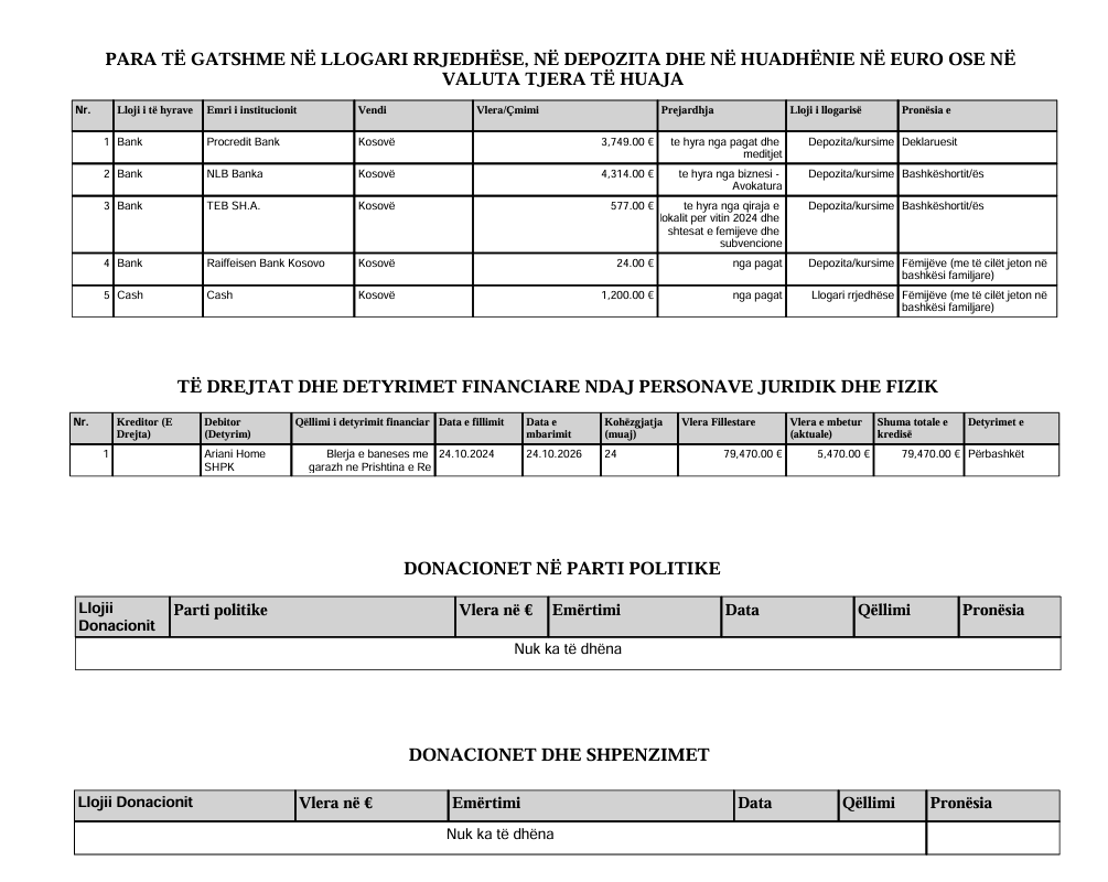 Gjithashtu, Gashi ka deklaruar edhe 5 mijë e 470 euro detyrime financiare që ka thënë se i ka marrë për të blerë një banesë dhe garazh tek Prishtina e Re.