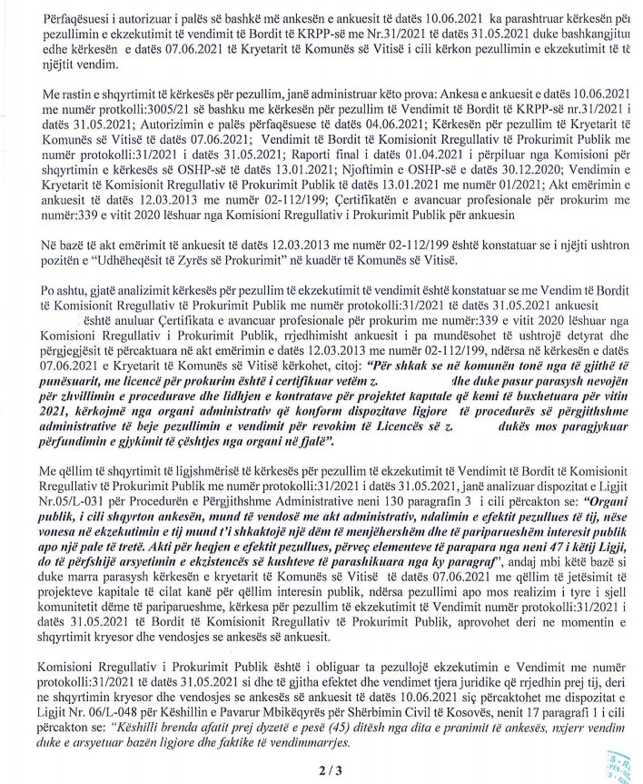“Personi i cili ka parashtruar ankesë në KPMSHCK, lidhur me anulimin e certifikatës së prokurimit, nga ana e KRPP-së, është menaxheri i prokurimit në Komunën e Vitisë z. Fadil Abazi, i cili përmes përfaqësuesit të tij ligjor ka parashtruar ankesë në Këshill me datë 10.06.2021 me kërkesën për pezullim e ekzekutimit të vendimit të Bordit të KRPP-së të datës 31.05.2021 sipas të cilit ankuesit i anulohet Çertifikata e avancuar profesionale për prokurim dhe po ashtu së bashku me provat e bashkangjitura të lëndës, ankuesi ka bashkangjitur edhe shkresën e Kryetarit të Komunës së Vitisë përmes së cilës i njëjti mbështet kërkesën për pezullim të ankuesit me arsyetimin se në komunën e Vitisë nga të gjithë të punësuarit me licencë për prokurim është i certifikuar vetëm z. Fadil Abazi, ndërsa me anulimin e certifikatës pamundësohet zhvillimi i procedurave dhe lidhja e kontratave për projektet kapitale që kemi të buxhetuara për vitin 2021. KPMSHCK pas administrimit dhe shqyrtimit të provave të lëndës të ofruara nga palët në procedurë, në pajtim me nenin 6 paragrafin 1 nën paragrafi 1.1 si dhe nenin 18 paragrafin 1 nën paragrafin 1.9 të Ligjit Nr. 06/L-048 për Këshillin e Pavarur Mbikëqyrës për Shërbimin Civil të Kosovës, si dhe nenin 130 të Ligjit Nr.05/L-031 për Procedurën e Përgjithshme Administrative ka nxjerr vendim me datë 21.06.2021 me të cilin e ka aprovuar vetëm kërkesën e ankuesit z. Fadil Abazi për pezullim e ekzekutimit të vendimit të Bordit të KRPP, ndërsa nuk ka vendosur për ankesën e tij”, thuhet në përgjigjen e në KPMSHCK-së për lajmi.net.