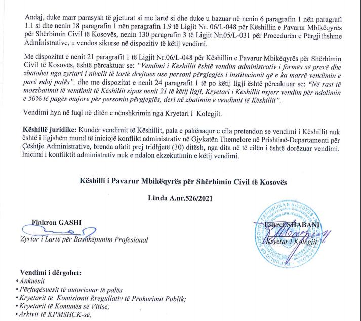 “Andaj për vëmendje tuaj ritheksojmë se, KPMSHCK të Kosovës nuk ka pranuar ankesë nga ana e kryetarit të Komunës të Vitisë, ndërsa vendimi i datës 21.06.2021 me numër A.nr.526/2021 i Këshillit ka karakter të përkohshëm dhe nuk është përfundimtar në procedurë, rrjedhimisht efekti i tij siç është specifikuar në pikën I të dispozitivit është deri në momentin e shqyrtimit të ankesës së datës 10.06.2021 siç përcaktohet me dispozitat e Ligjit Nr. 06/L-048 për Këshillin e Pavarur Mbikëqyrës për Shërbimin Civil të Kosovës, nenit 17 paragrafi 1 i cili përcakton se: “Këshilli brenda afatit prej dyzetë e pesë (45) ditësh nga dita e pranimit të ankesës, nxjerr vendim duke e arsyetuar bazën ligjore dhe faktike të vendimmarrjes”, ndërsa vendimi në fjalë ka përmbajtur edhe Këshillin Juridike për palët: “Kundër vendimit të Këshillit, pala e pakënaqur e cila pretendon se vendimi i Këshillit nuk është i ligjshëm mund të iniciojë konflikt administrativ në Gjykatën Themelore në Prishtinë-Departamenti për Çështje Administrative, brenda afatit prej tridhjetë (30 ditësh, nga dita në të cilën i është dorëzuar vendimi. Inicimi i konfliktit administrativ nuk e ndalon ekzekutimin e këtij vendimi””, thuhet tutje në përgjigjen e KPMSHCK-së.