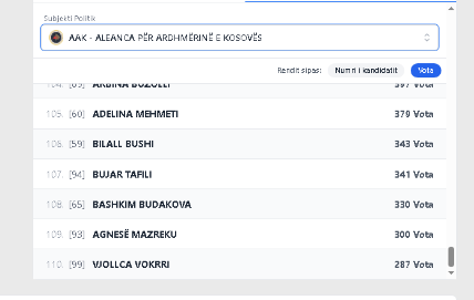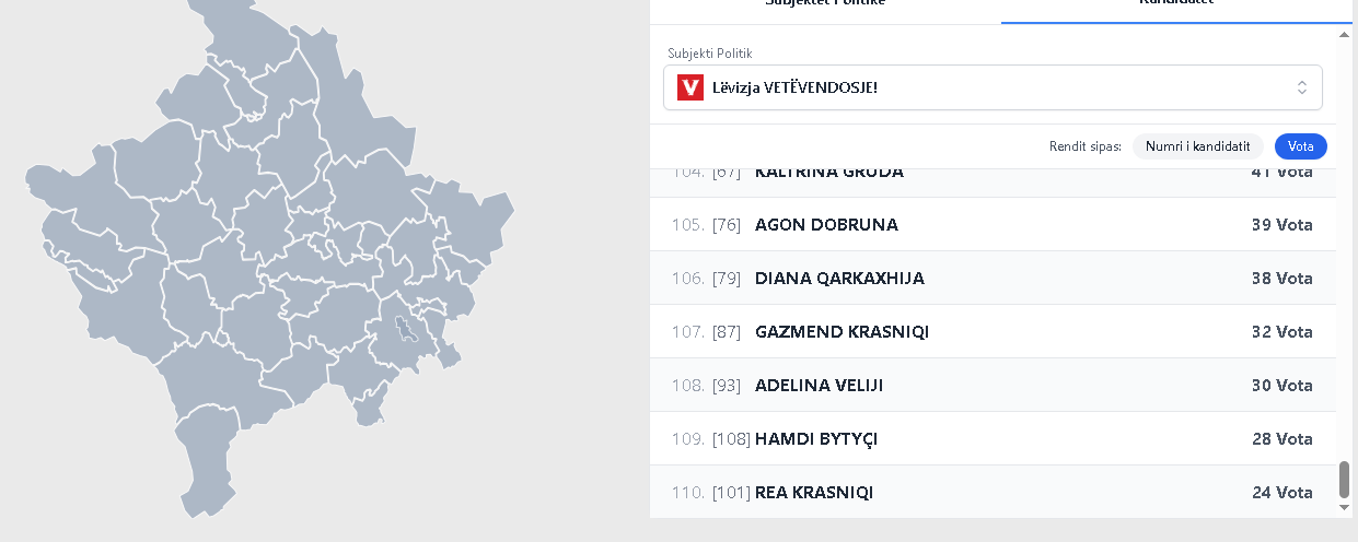 Kandidatët më të votuar në VV janë: Albin Kurti me mbi 3 mijë vota, Glauk Konjufca me mbi 2 mijë e 500 vota, Albulena Haxhiu me mbi 1 mijë e 700 vota, Hekuran Murati me mbi 1 mijë e 600 vota, Donika Gërvalla gati 1 mijë e 600 vota.