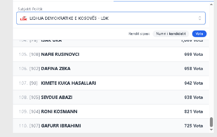 Në Lidhjen Demokratike të Kosovës (LDK), më shumë vota kanë marrë: Lumir Abdixhiku, Hykmete Bajrami, Ukë Rugova dhe Doarsa Kica-Xhelili.