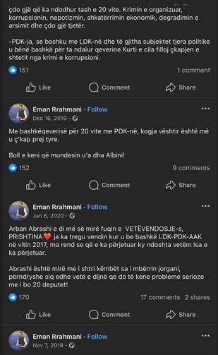 Por pavarësisht kësaj, Eman Rrahmani njihet për deklarime të shumta, e ndër të tjerash edhe për kohën kur tentonte të “gozhdonte” Partinë Demokratike të Kosovës, asokohe sa ishte pjesë e Vetëvendosjes.