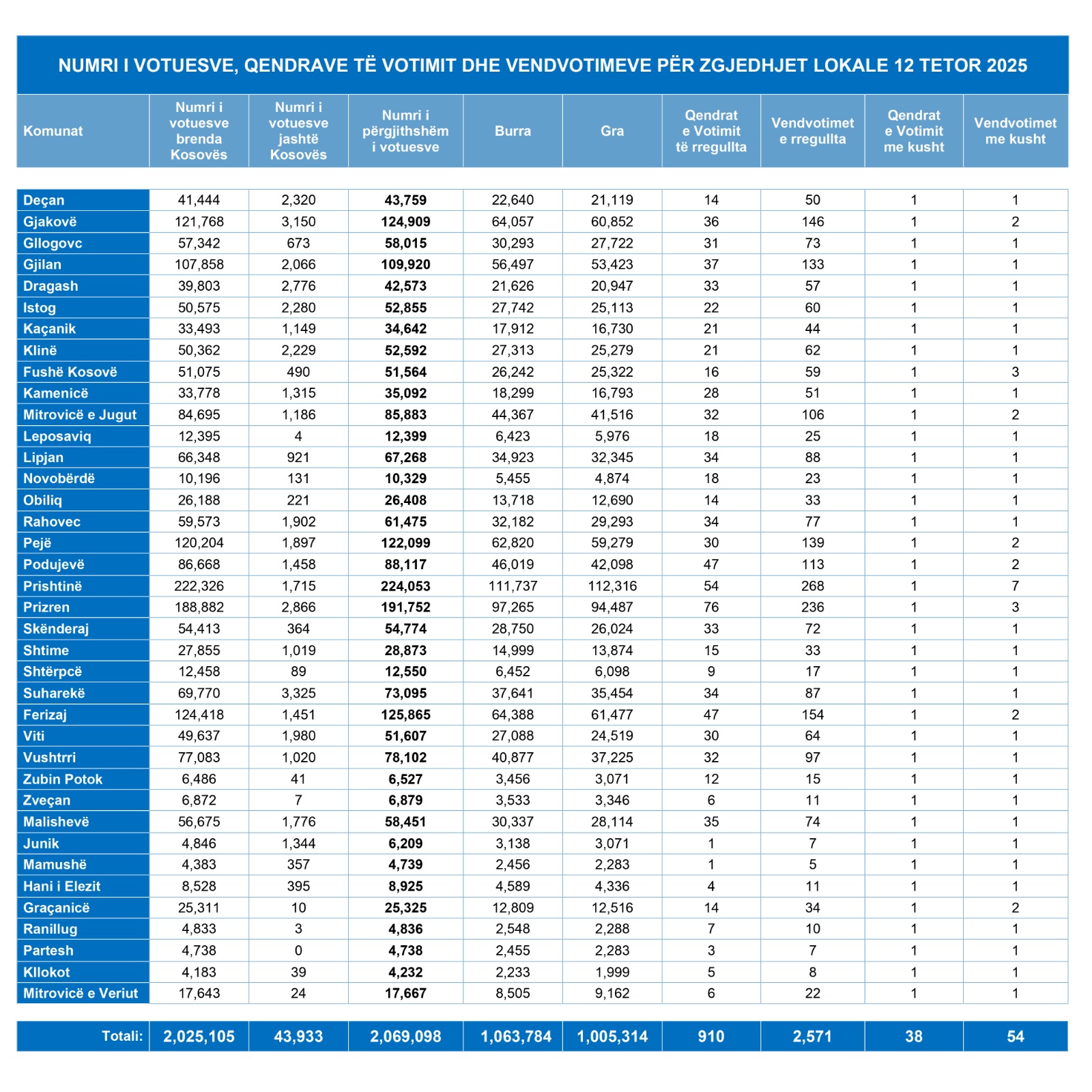 Sipas të dhënave zyrtare, në listat e votuesve janë të regjistruar gjithsej 2,069,098 qytetarë, përfshirë 43,933 votues jashtë Kosovës.