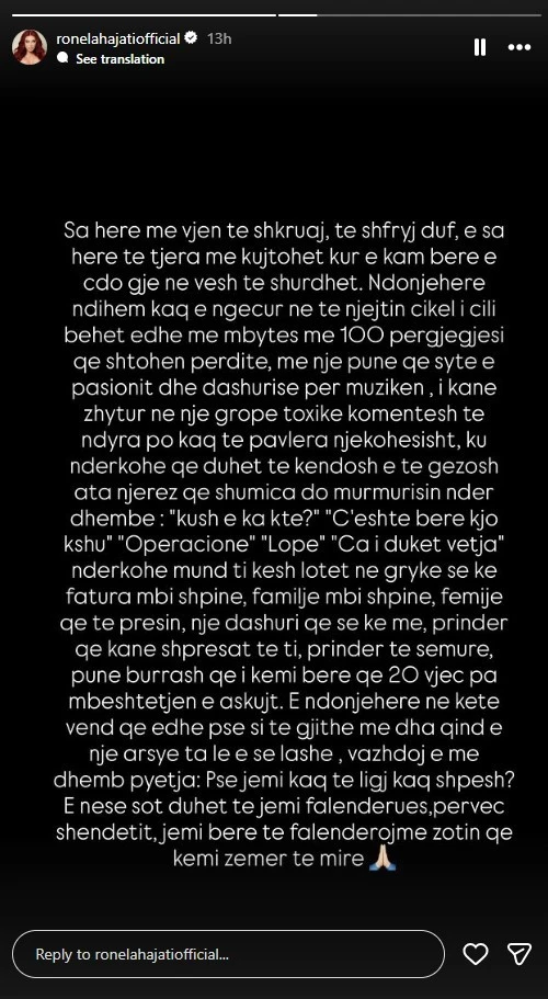Këngëtarja e njohur, Ronela Hajati, ka ndarë së fundmi në rrjetet sociale një postim të fuqishëm dhe emocional, ku flet hapur për presionin dhe komentet negative me të cilat përballet në jetën publike.