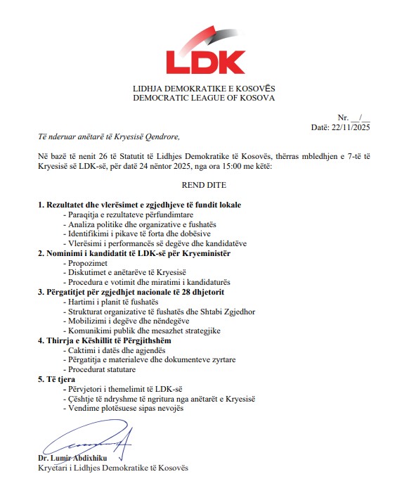 Si pikë e dytë e rendit të ditës është edhe nominimi i kandidatit të LDK-së për kryeministër.