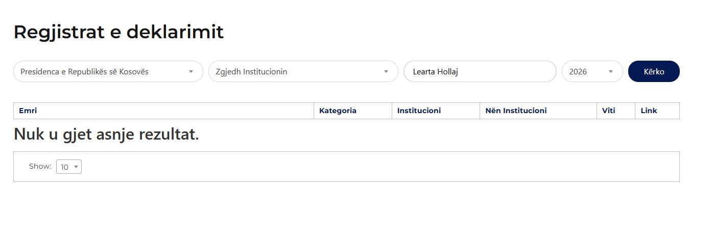 Learta Hollaj, shefja e kabinetit të ish-presidentes Vjosa Osmani, vazhdon të mos ketë të deklaruar pasurinë në Agjencinë për Parandalimin e Korrupsionit, tashmë për katër vite me radhë, përfshirë edhe vitin 2026.