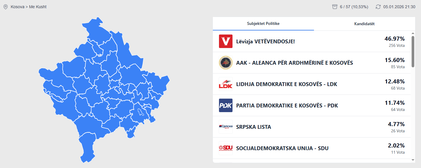 Lëvizja Vetëvendosje ka marrë 46.97 % apo 256 vota nga votimi me kusht nga numërimi i gjashtë kutive të para. PDK ka 64 vota apo 11.74%, LDK 68 vota apo 12.48% dhe AAK 85 vota apo 15.60%, shkruan lajmi.net. Rezultate live nga votat me kusht.