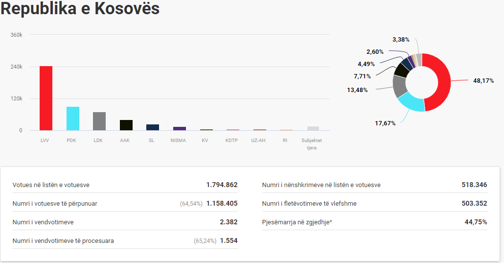 Sipas rezultateve të deritanishme ku janë numëruar 503,352 vota, Lëvizja Vetëvendosje prinë me 48,17 për qind të tyre, shkruan lajmi.net.
