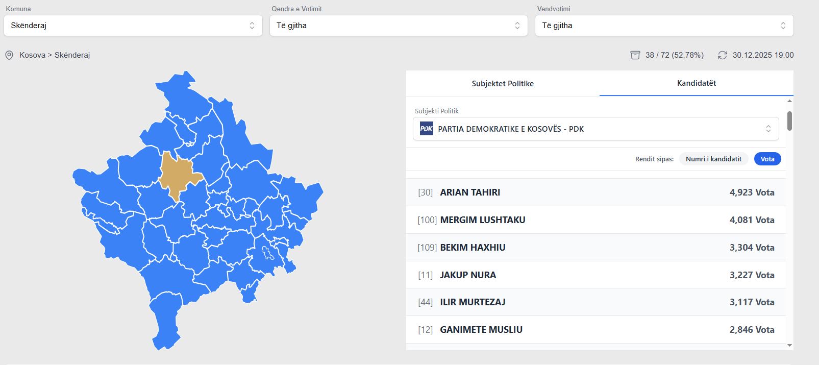 Mbi 52 për qind e votave të numëruara në Skenderaj: Arian Tahiri më shumë vota se Mergim Lushtaku, Bekim Haxhiu, Jakup Nura dhe Xhevahir Geci