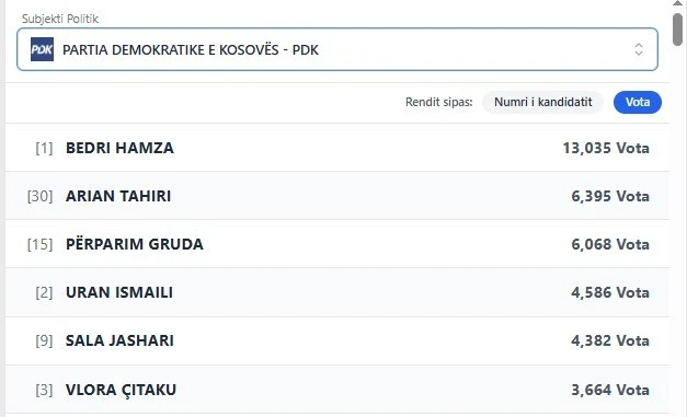 Komisioni Qendror i Zgjedhjeve ka filluar numërimin e votave për kandidatët për deputetë që nga ora 12:00, dhe deri tani janë numëruar mbi 8% të votave. Në këtë fazë, një surprizë ka ardhur nga Lidhja Demokratike e Kosovës (PDK), ku Arian Tahiri ka kapur një pozicion të fortë, duke u renditur i dyti pas Bedri Hamzës, me 6,235 vota, ndërsa Hamza kryeson listën me 12,584 vota.
