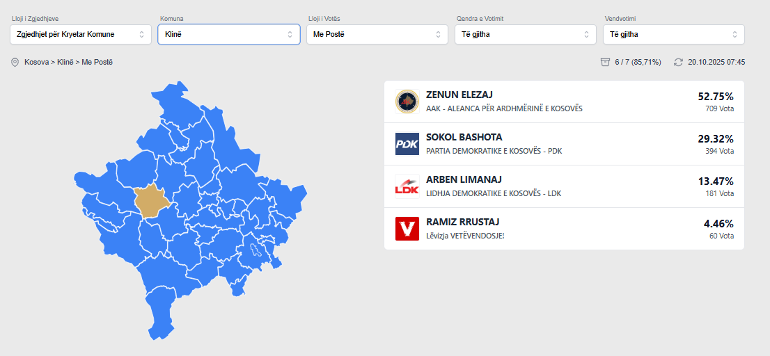 Janë numëruar mbi 85% e votave me postën në komunën e Klinës. Kandidati i AAK-së, Zenun Elezaj, po prin bindshëm me 709 vota apo 52.75%, duke lënë pas kandidatin e PDK-së Sokol Bashota me 394 vota apo 29.32%. I treti renditet Arben Limanaj me 181 ota apo 13.47%, kursei katërti Ramiz Rrusta me 60 vota…