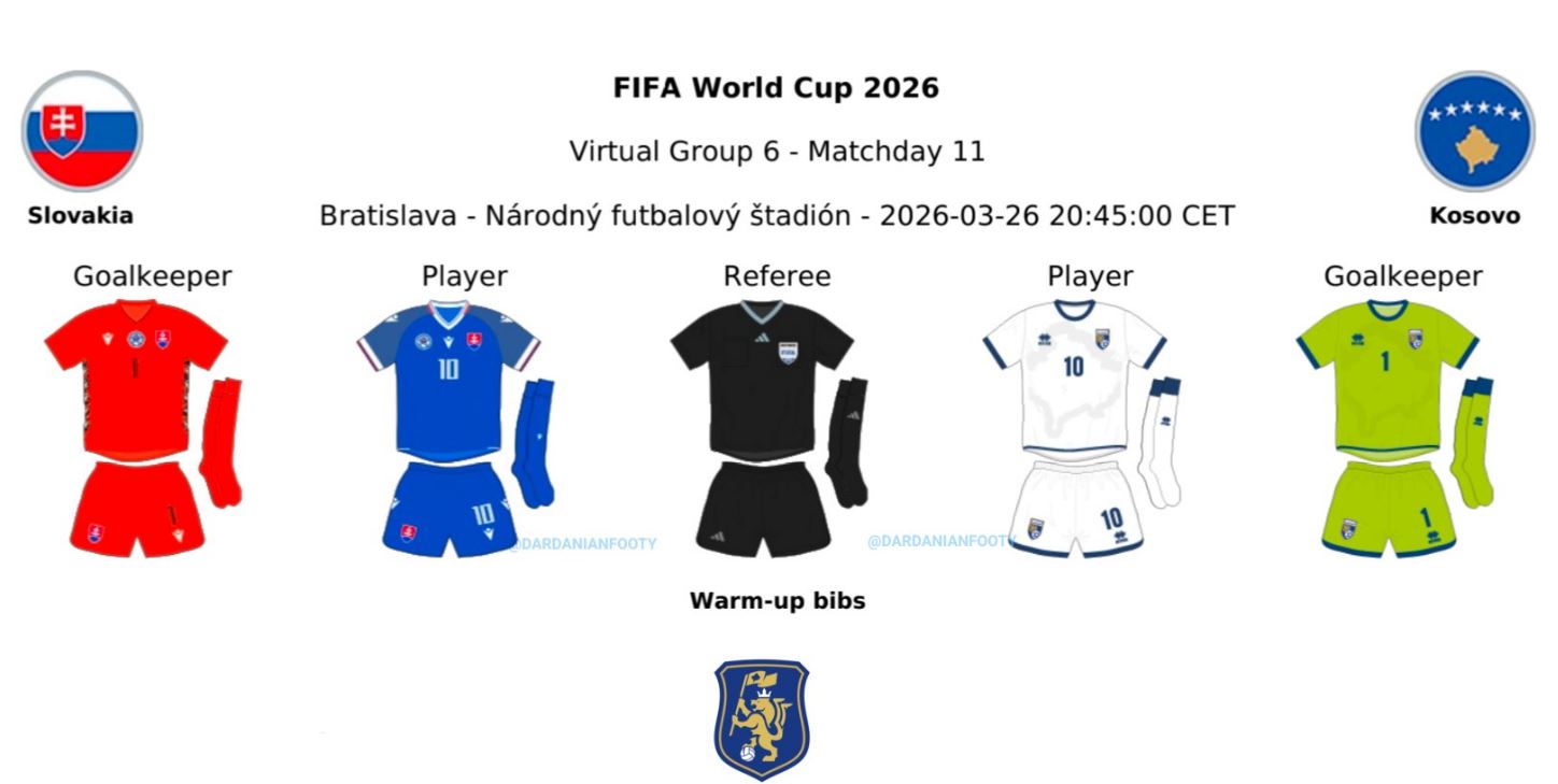 Kombëtarja e Kosovës sonte luan ndeshjen jetike ndaj Sllovakisë, e vlefshme për kualifikim në Kupën e Botës 2026. Është mësuar se “Dardanët” do të bartin fanellën e bardhë. Kundërshtarët, si vendas do të luajnë me fanellën e parë, atë të kaltër. Kujtojmë që me ngjyrën e bardhë, Kosova ka pasur shumë fat gjatë ndeshjeve të…