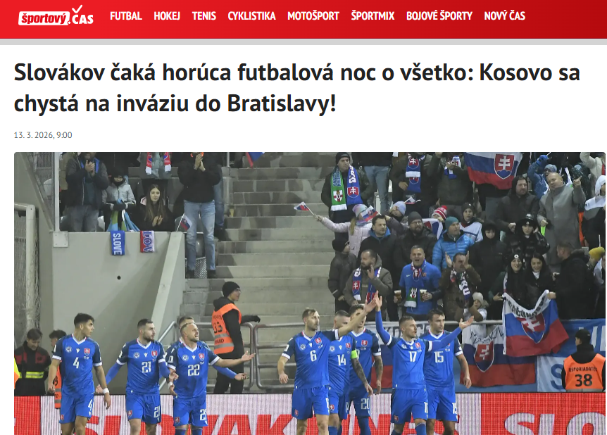 Mediumi sllovak Športový Čas ka raportuar se përfaqësuesja e Kombëtarja e Sllovakisë në futboll duhet të tregojë kujdes për shkak të mbështetjes së madhe që pritet të ketë Kombëtarja e Kosovës në futboll nga tifozët e saj.