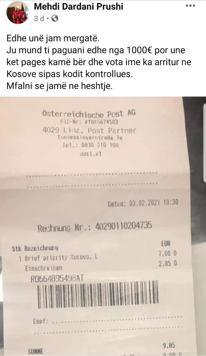 Mehdi Dardani Prushi nëpërmjet një postimi në Facebook ka treguar se vota e tij ka arritur në Kosovë për vetëm 10 euro pagesë.