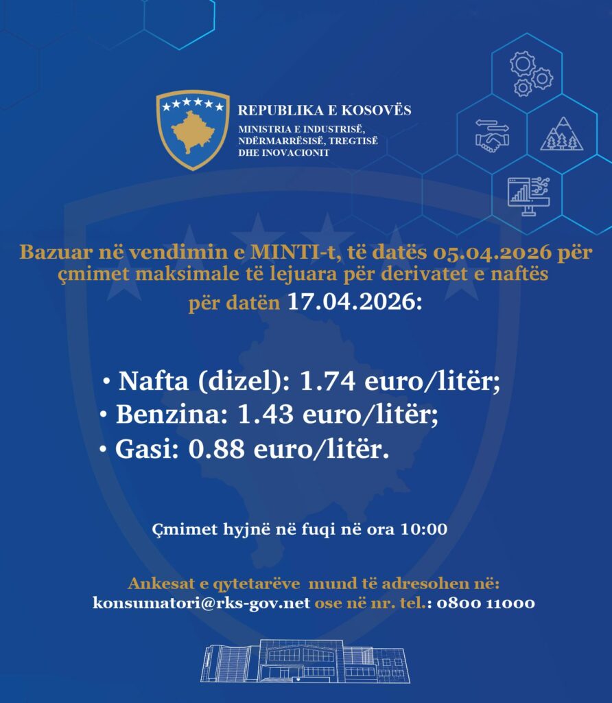 Ministria e Industrisë, Ndërmarrësisë, Tregtisë dhe Inovacionit ka publikuar çmimet maksimale të lejuara të derivateve të naftës për datën 17.04.2026. Sipas njoftimit zyrtar, çmimet që hyjnë në fuqi nga ora 10:00 janë: Nafta (dizel): 1.74 euro/litër Benzina: 1.43 euro/litër Gazi: 0.88 euro/litër Qytetarët mund të paraqesin ankesa lidhur me çmimet përmes emailit [email protected] ose në…