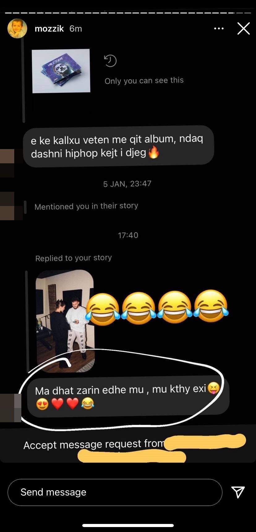 “Ma dhat zarin edhe mu, mu kthy exi”, i shkroi ndjekësi, ndërsa Mozzik publikoi bisedën e tij.