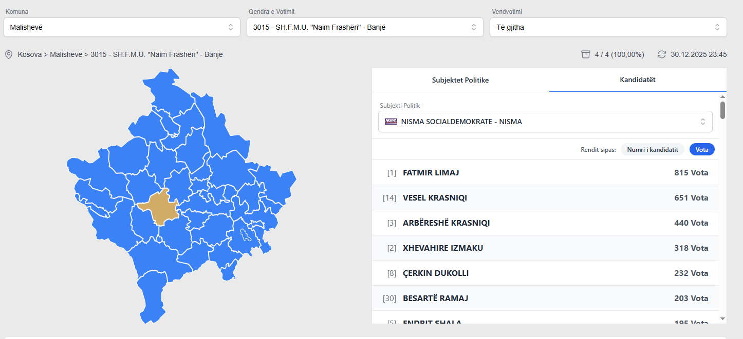 Nisma Socialdemokrate e Kosovës, me kryetar Fatmir Limajn, nuk ka arritur ta kaloj pragun që nevojitet për të hyrë në Kuvendin e Kosovës. Ajo në këto zgjedhje ka marrë vetëm 1.7% të të gjitha votave. Kryetari i kësaj partie, Fatmir Limaj nuk gjeti përkrahje as në Komunën e tij, pasi as në këtë Komunë nuk…