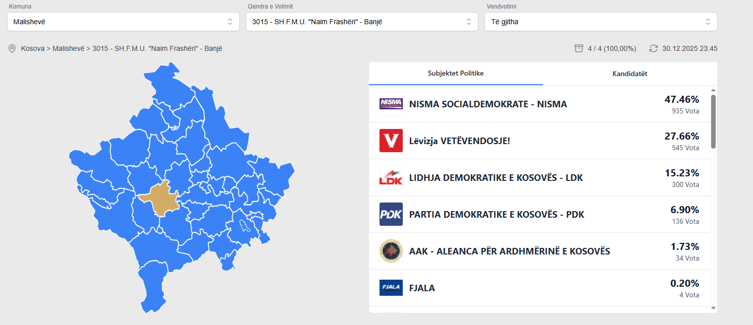 Në Banjë të Malishevës, fshati ku edhe ka lindur Fatmir Limaj, ka dal e para me 47,46% të votave duke lënë pas VV-në me 27,66% të votave.