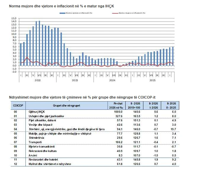 “Indeksi i tërësishëm i harmonizuar i çmimeve të konsumit është më i lartë në një mesatare prej 0,6 % në muajin shkurt 2026, krahasuar me muajin janar 2026”, theksohet në raport.