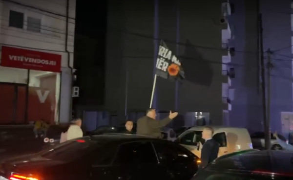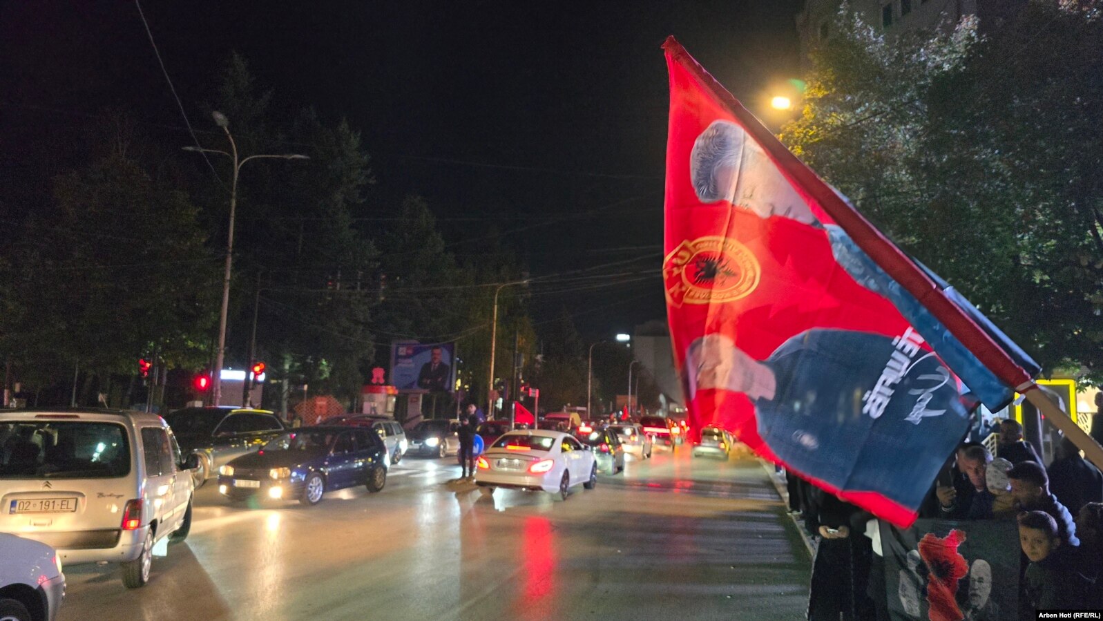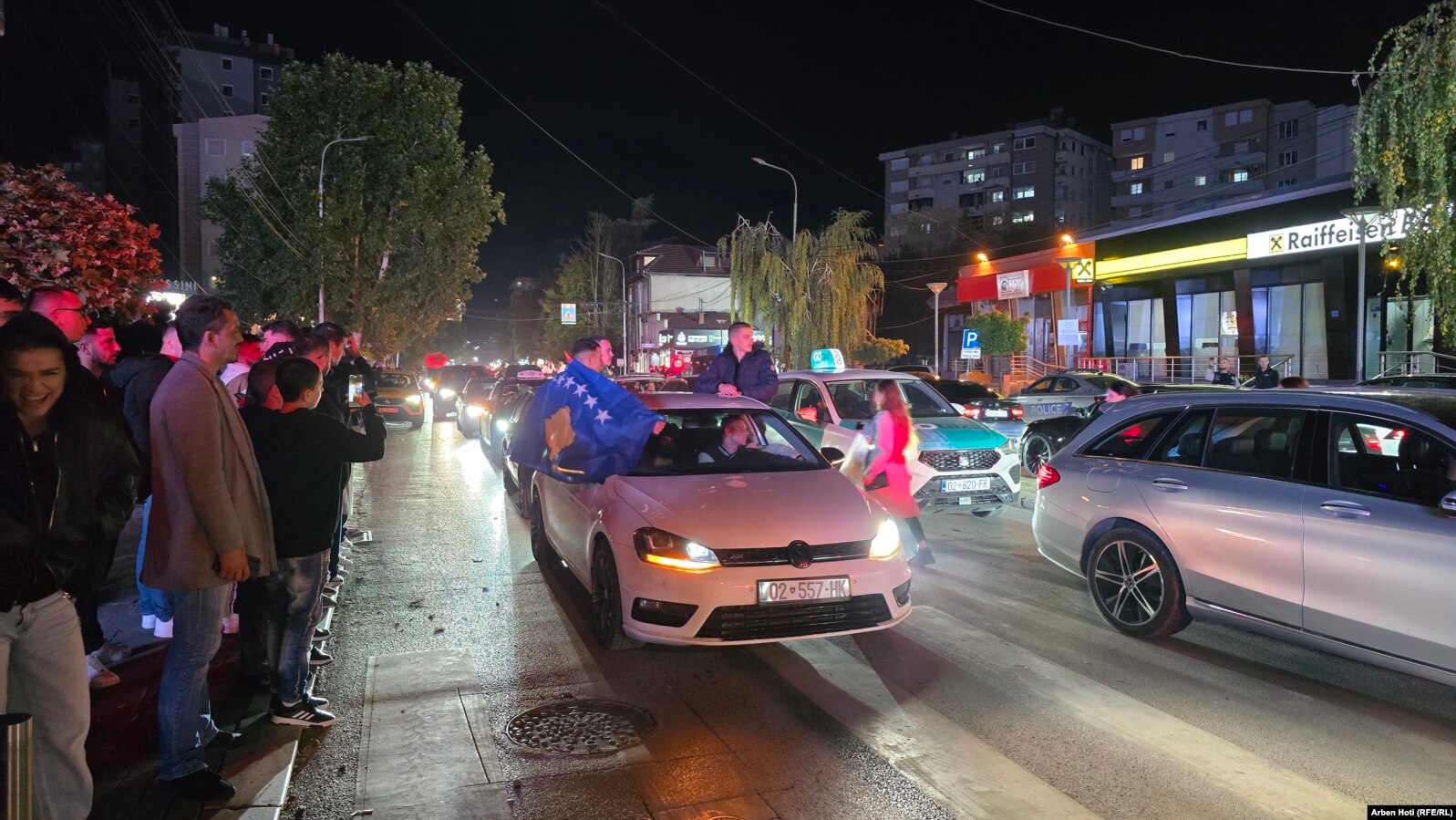 KosovaPresska siguruar pamje nga vendi i ngjarjes, ku shihen simpatizantët duke brohoritur dhe duke lëshuar boritë e veturave.