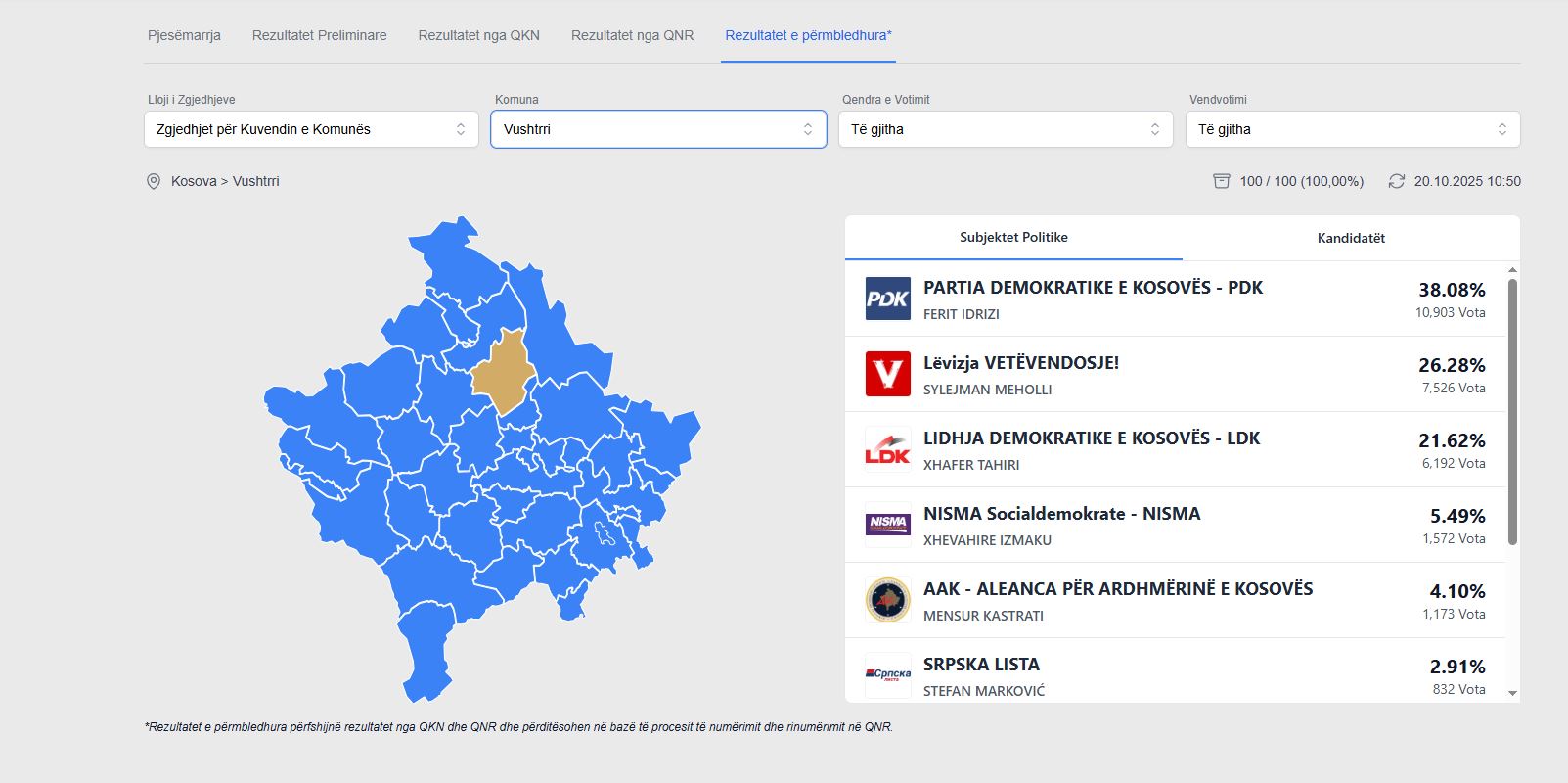 Në rezultatet e zgjedhjeve në këtë komunë, VV mori 26.28%, kurse LDK-ja mori 21.62 për qind.