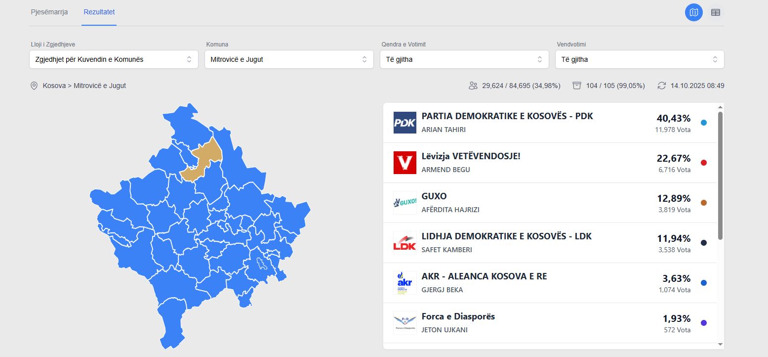 Në Mitrovicë, sipas të dhënave të fundit të Komisionit Qendror të Zgjedhjeve, nga 99.05 e vendvotimeve të procesuara, Partia Demokratike e Kosovës radhitet e para me 40,43% (11,978 vota), pasuar nga Lëvizja Vetëvendosje me 22,67% (6,716 vota).