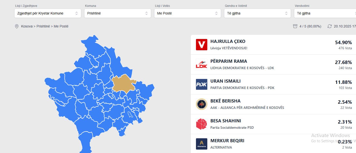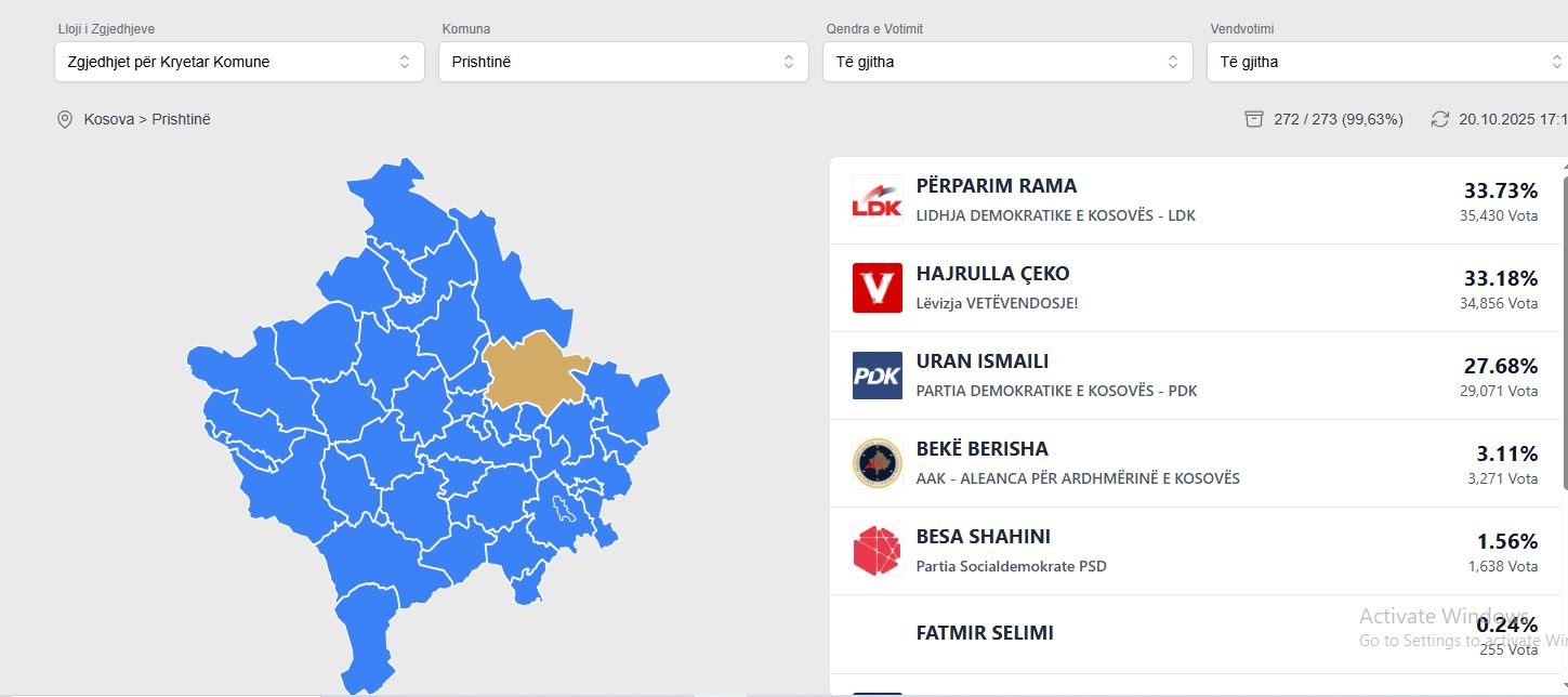 Nga përditësimi i fundit del se kandidati i LDK-së njëherësh kryetari aktual i kryeqytetit, Përparim Rama, i ka marrë 476 vota nga bashkëatdhetarët apo 54.90 për qind, derisa kundërkandidati i tij nga LVV-ja Hajrulla Çeko, i ka 240 vota apo 27.68 për qind e votave.