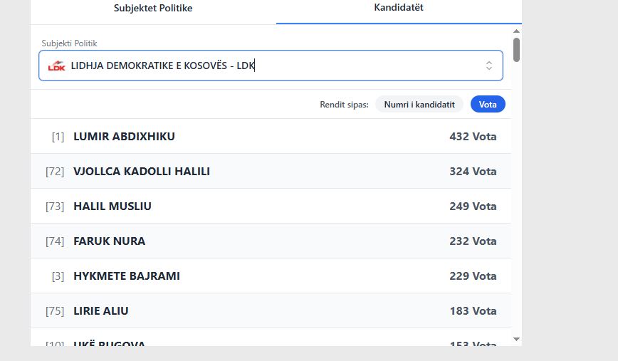 Në LDK është Lumir Abdixhiku, pas tij Vjollca Kadolli Halili, Halil Musliu, Faruk Nura dhe Hyekmete Bajrami.