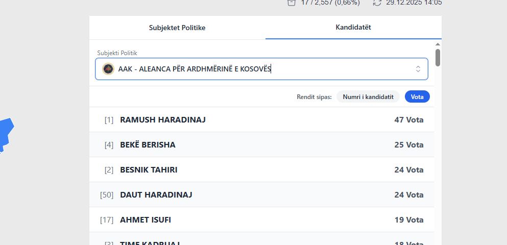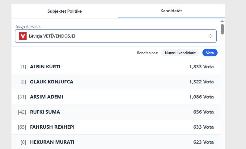 Në Vetëvendosje po prinë votat për Albin Kurtin, Glauk Konjufcën, Arsim Ademi, Rufki Sumën, Fahrush Rexhepin e pas tij edhe Hekuran Murati me një afërsi votash.