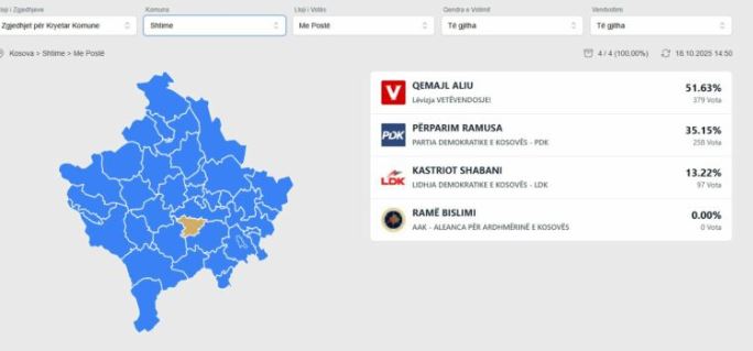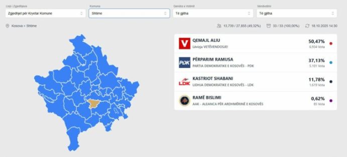 Në komunën e Shtimes janë numëruar 100 për qind e votave të diasporës. Nga ky numërim, sipas të dhënave të publikuara nga KQZ, kryetari aktual i Shtimes, Qemajl Aliu prin me 51.63% të votave, e cili pasohet nga Përparim Ramusa i PDK-së, i cili ka grumbulluar plot 35.15% të votave. Aliu prin edhe në rezultatet…