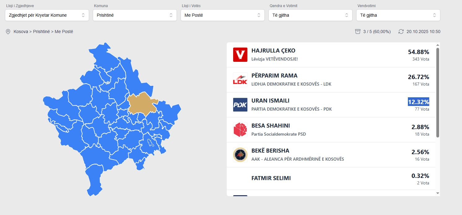 Nga këto vota, prin kandidati i VV-së për kryetar të Prishtinës, Hajrulla Çeku me 54.88% të votave me postë.