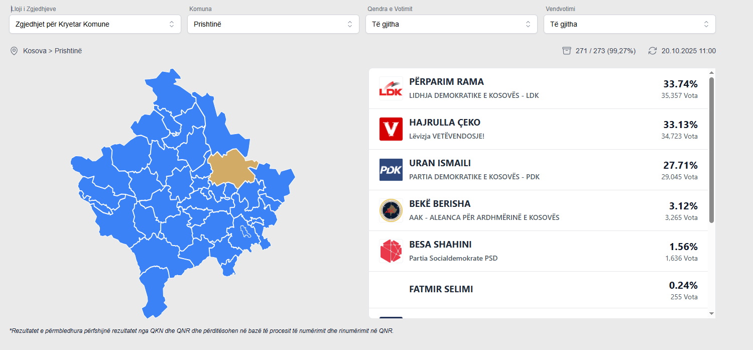 Nga rezultatet e përmbledhura të numëruara në QKN dhe QNR, Komuna e Prishtinës do të jetë në balotazh mes Përparim Ramës së LDK-së dhe Hajrulla Çekut të VV-së.