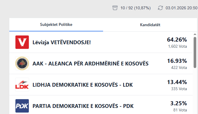 Sipas rezultateve të procesuara nga KQZ, Lëvizja Vetëvendosje ka 1602 vota apo 64.26 për qind, transmeton lajmi.net.